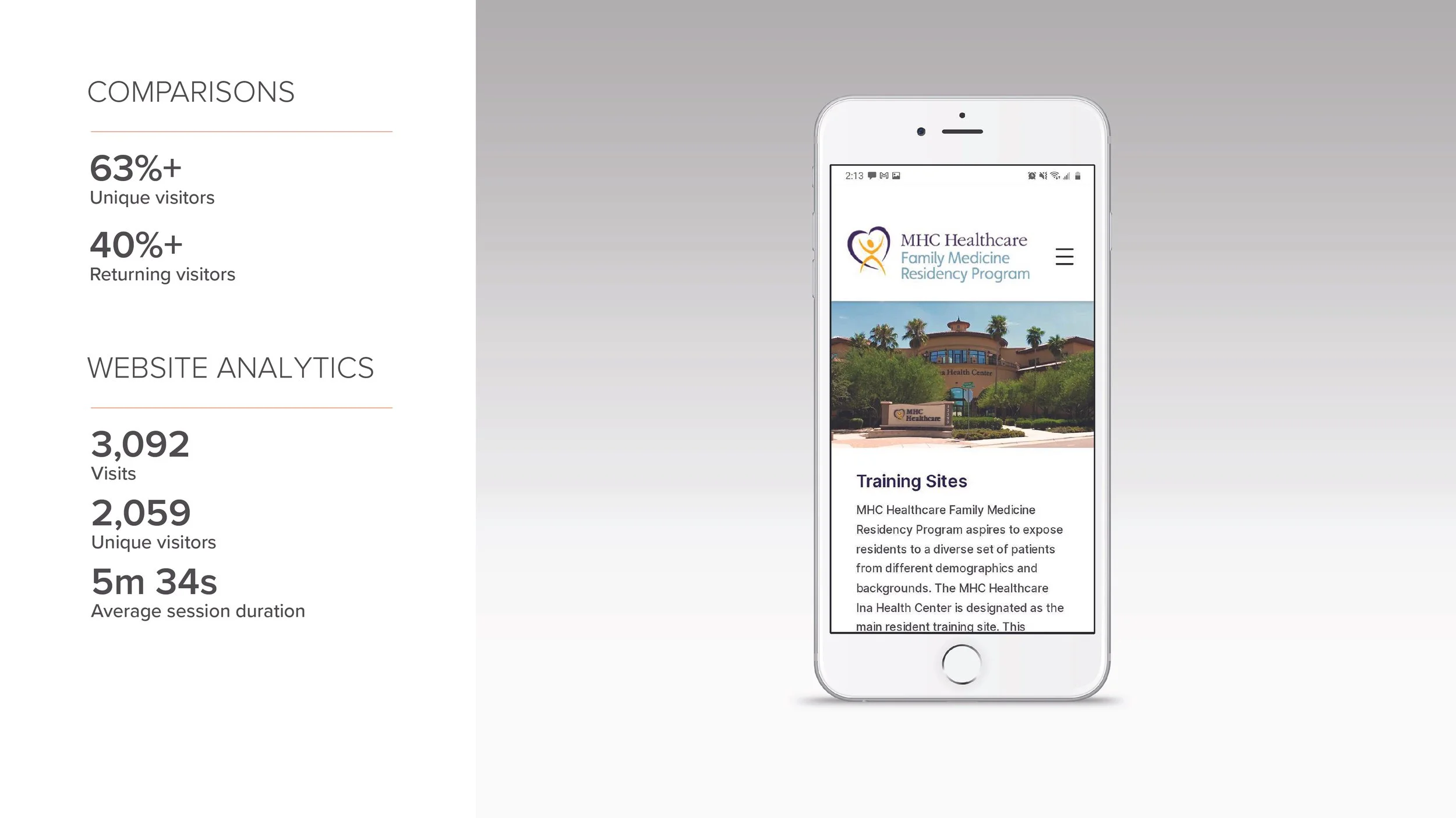 Overall, the website helped MHCFRP successfully fill all four available positions by securing them approximately 300 applicants to fill all 55 interview slots. The site was an immediate success with over 10 requests for information in the first month. By July of 2023, the site had also collected 34 credible requests for information—11 of which were from out of state—and MHC Healthcare was able to fill all interviews for their first session, indicating they received the number of applicants needed for the program. Additionally the site is performing better than others in its category across the board, according to Google Analytics’ comparison of this site against others in “medical education” and “non-profit” sectors, with the following stats to show: 3,173 site visits, with 2,174 unique visits, which is 63% better than competitors, along with a returning visitor rate at 40% better.