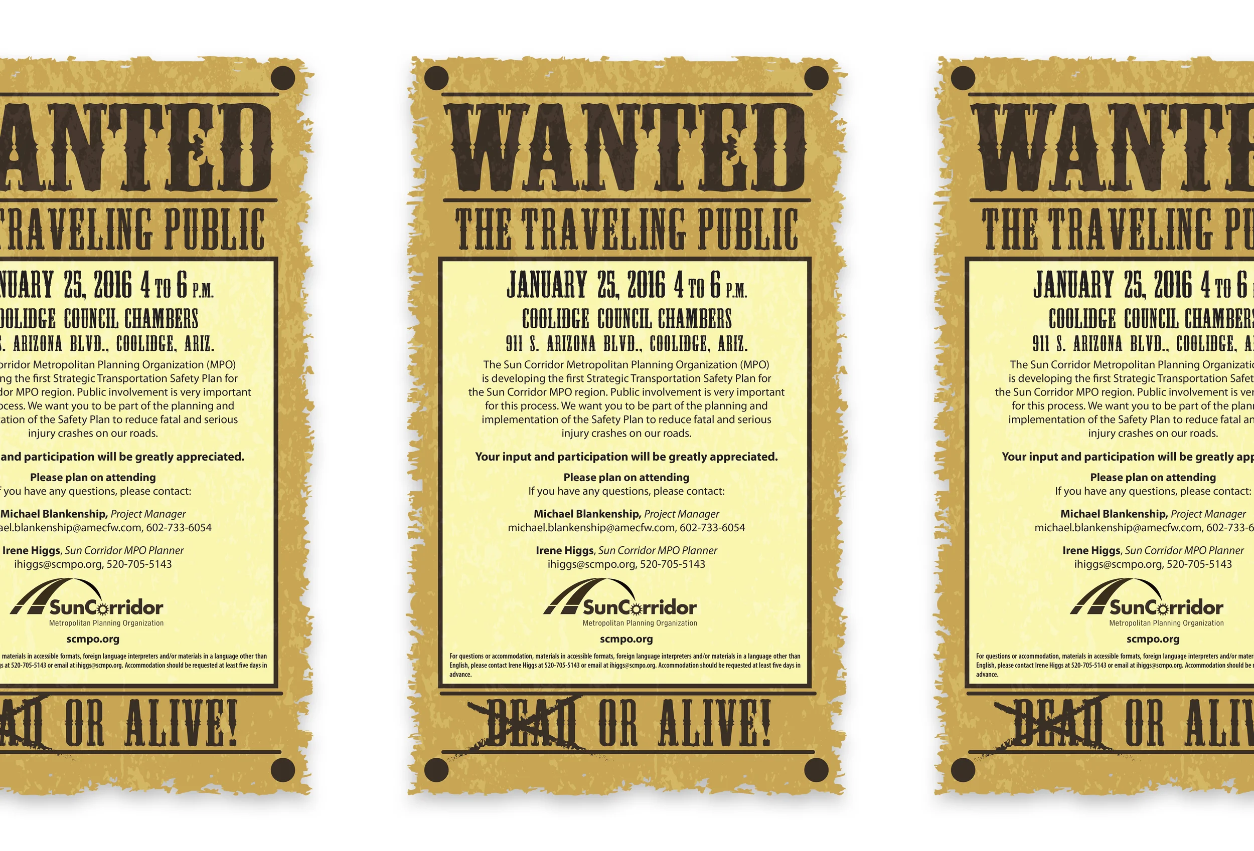 The Sun Corridor Metropolitan Planning Organization provides transportation planning services to the communities of Casa Grande, Coolidge, Eloy and select portions of Pinal County, a territory covering 1,115 square miles. As a recently formed organization, Sun Corridor MPO had not successfully solidified and defined its brand within the region nor its public outreach methods, materials and stakeholder contacts.